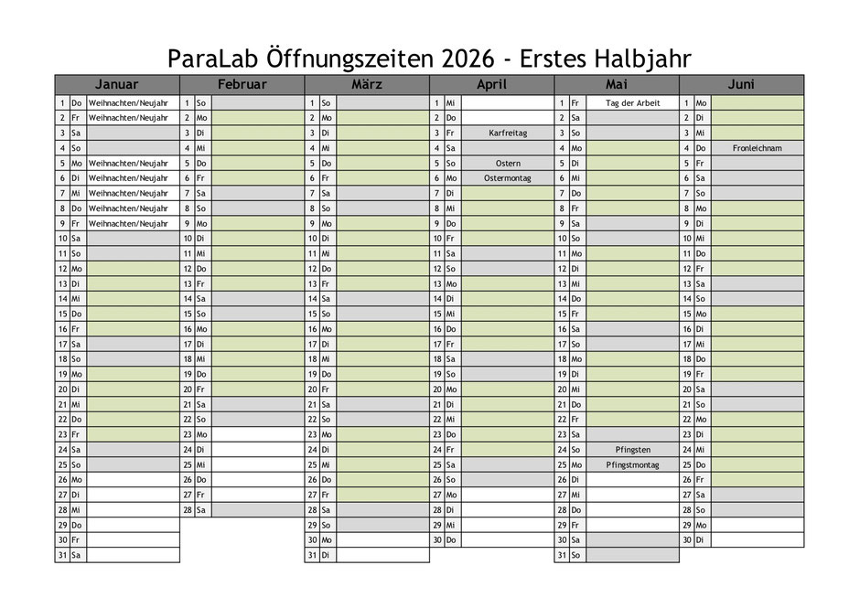 Jeweils die letzte Woche im Monat ist ParaLab geschlossen.